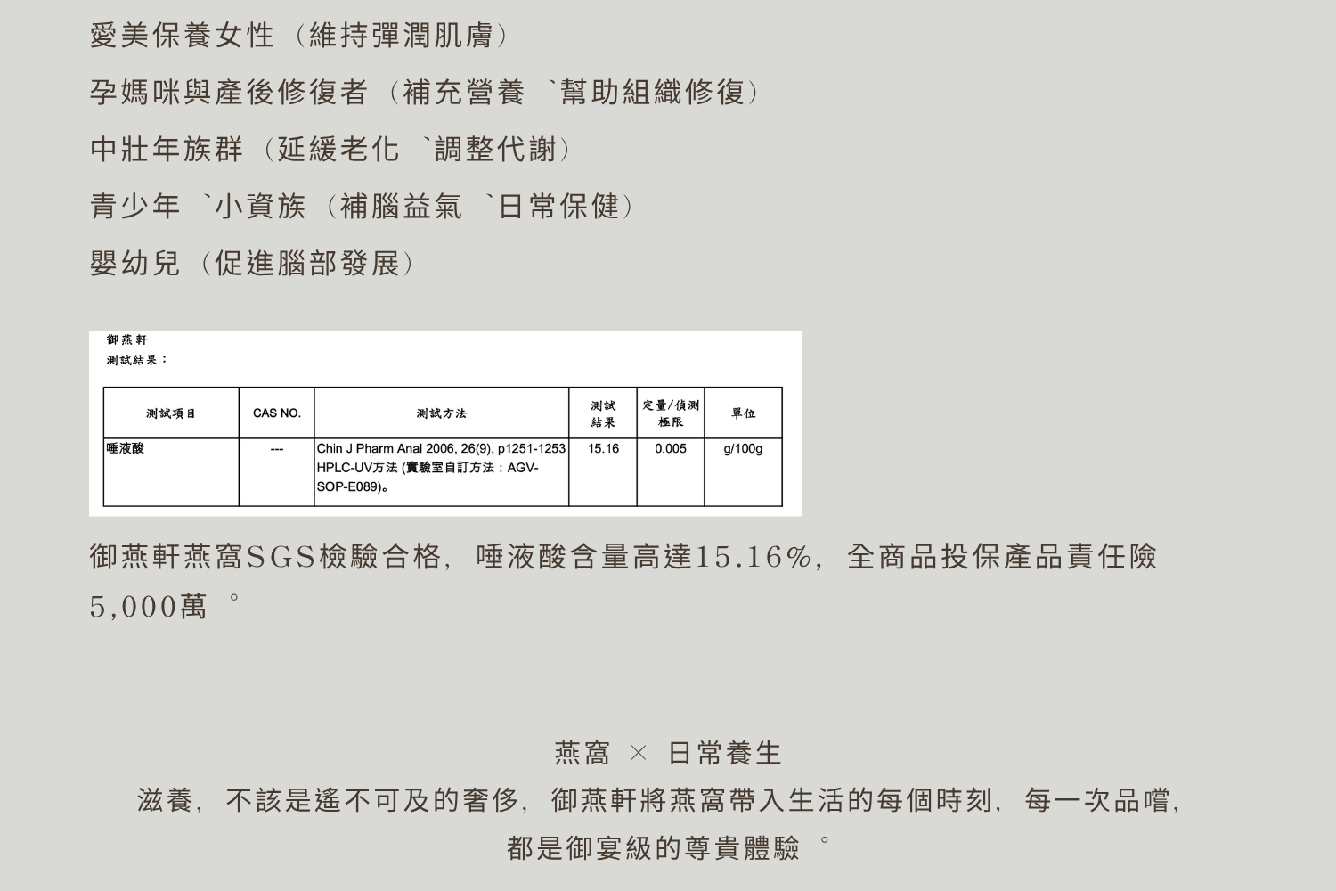 每一瓶嚴選 2.8 克乾燕盞燉煮而成,延續皇家御用傳統,口感細膩醇潤。無論是孕期滋養、壯年以上的日常保養,或作為體面大方的禮品,皆是最合宜的選擇。這份溫潤細膩,既是給自己的悉心呵護,也是獻給摯愛的珍貴心意。